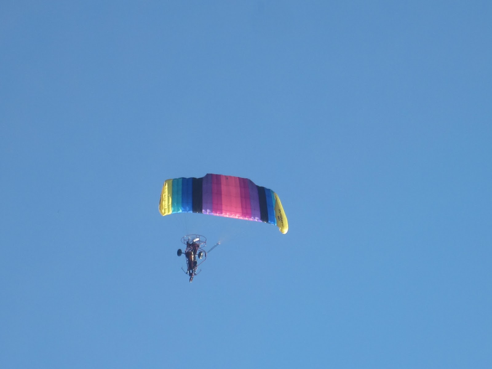 It looks like a go-kart...but it has a bright colorful parachute on top..it has a motor and he flies in the air with it!